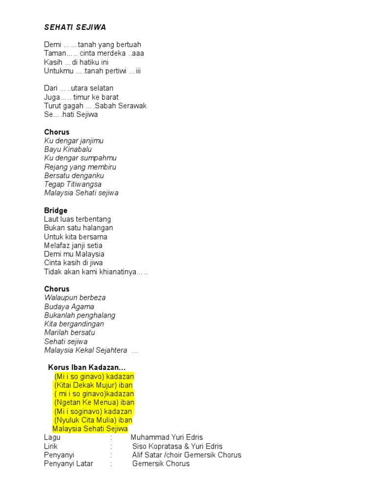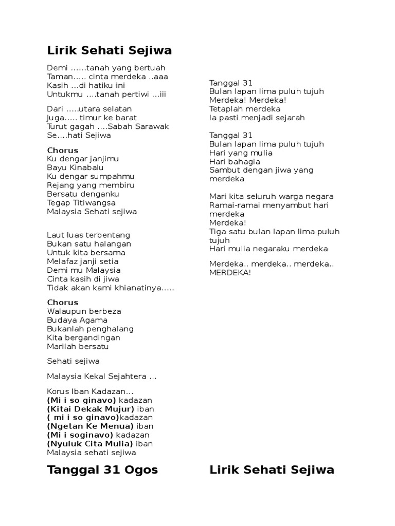 Lagu tema hari kebangsaan hari Malaysia 2015. Dari utara selatan Juga timur ke barat Turut gagah Sabah Serawak Sehati Sejiwa. Chorus Walaupunberbeza BudayaAgama Bukanlahpenghalang Kitabergandingan Marilahbersatu Sehati sejiwa MalaysiaKekal SejahteraKorusIban Kadazan Mi i so ginavo kadazan Kitai DekakMujur iban mi i so ginavokadazan NgetanKe Menua iban Mi i soginavo kadazan NyulukCitaMulia iban MalaysiaSehati Sejiwa.